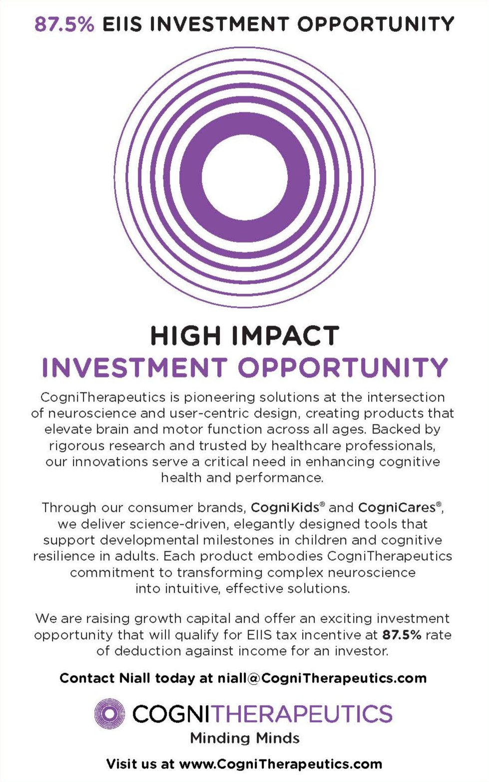 Investing in CogniTherapeutics offers an opportunity to support innovative cognitive health solutions while potentially achieving strong returns. Compliant with the EII scheme that allows 87.5% of the investment made in 2024 to be written off against taxable income for 2024, this investment combines financial incentives with a mission-driven focus. Backed by experienced founders, patented products, and advancements in AI and machine learning, CogniTherapeutics is positioned for growth in a market catering to diverse demographics, from children to individuals in rehabilitation. This opportunity is ideal for investors looking to align profit with impactful, health-focused innovation.